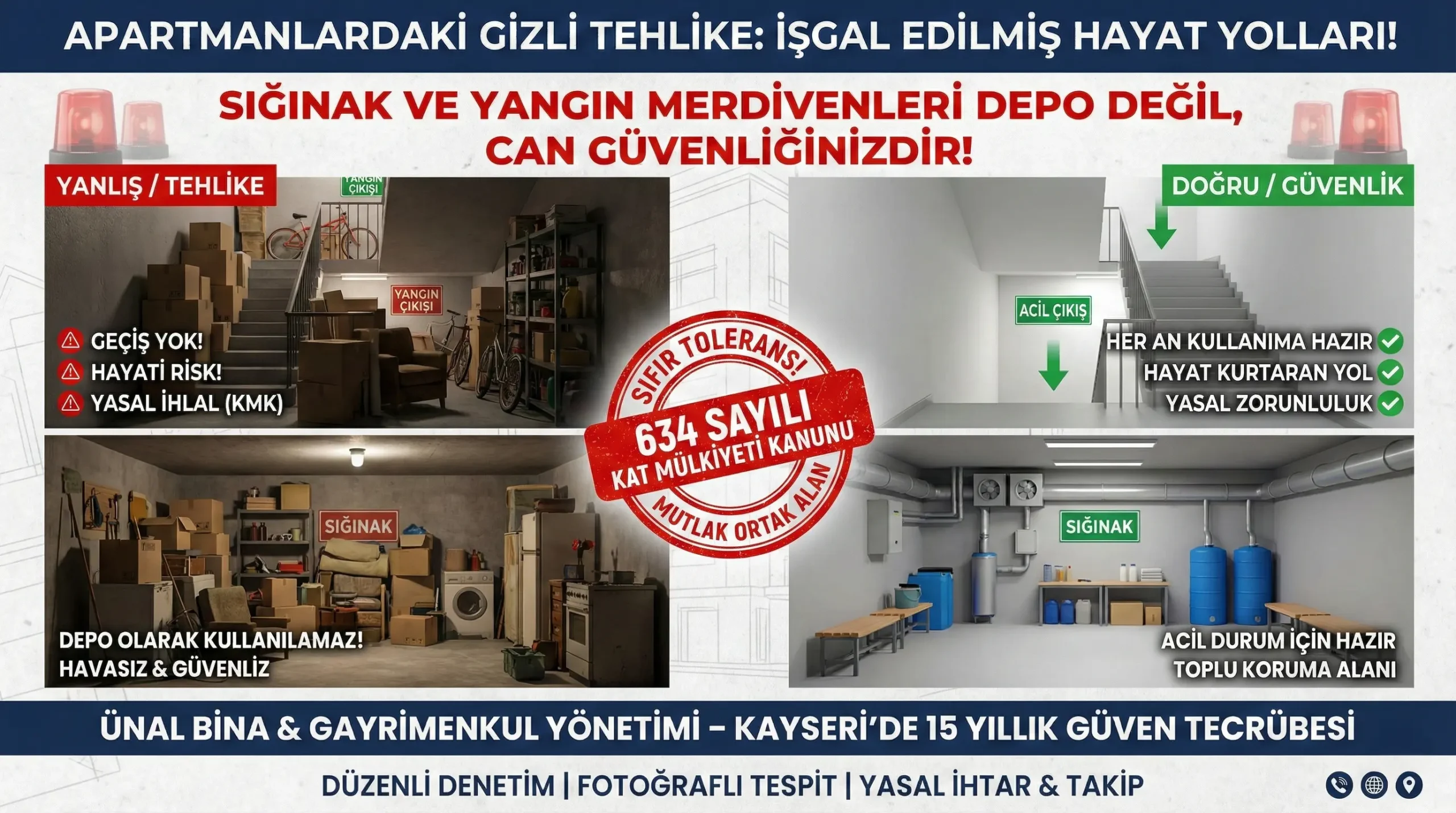 Modern şehir yaşamında, apartmanlar ve siteler sadece evimiz değil, ortak yaşam alanlarımızdır. Bu dikey köylerde konfor kadar güvenlik de en öncelikli konudur. Ancak ne yazık ki, çoğu zaman “bir şey olmaz” düşüncesiyle veya yer darlığı bahanesiyle en temel güvenlik kurallarını ihlal ediyoruz. Ünal Bina & Gayrimenkul Yönetimi olarak, Kayseri’de 15 yılı aşkın süredir edindiğimiz tecrübelerimizle, […]
